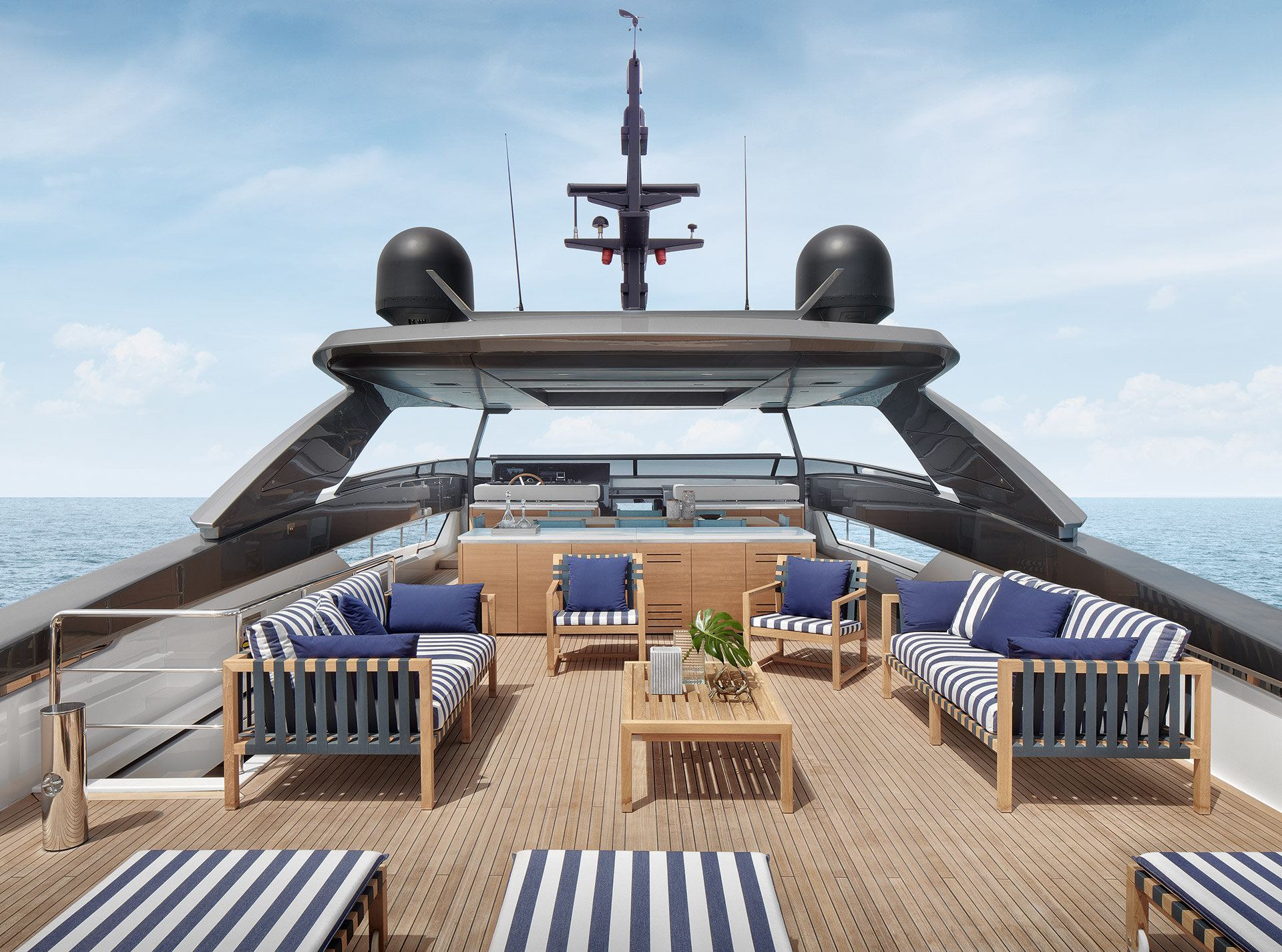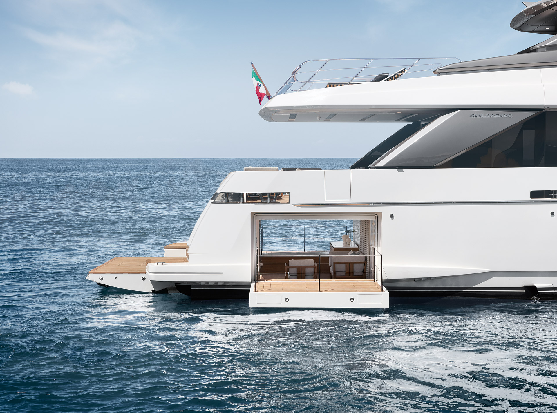 The SL120A exterior elevates asymmetry to its fullest expression, dissolving boundaries between inside and out. Sliding glass, lowered bulwarks and sculpted volumes create fluid circulation, panoramic sea views and expansive outdoor living.