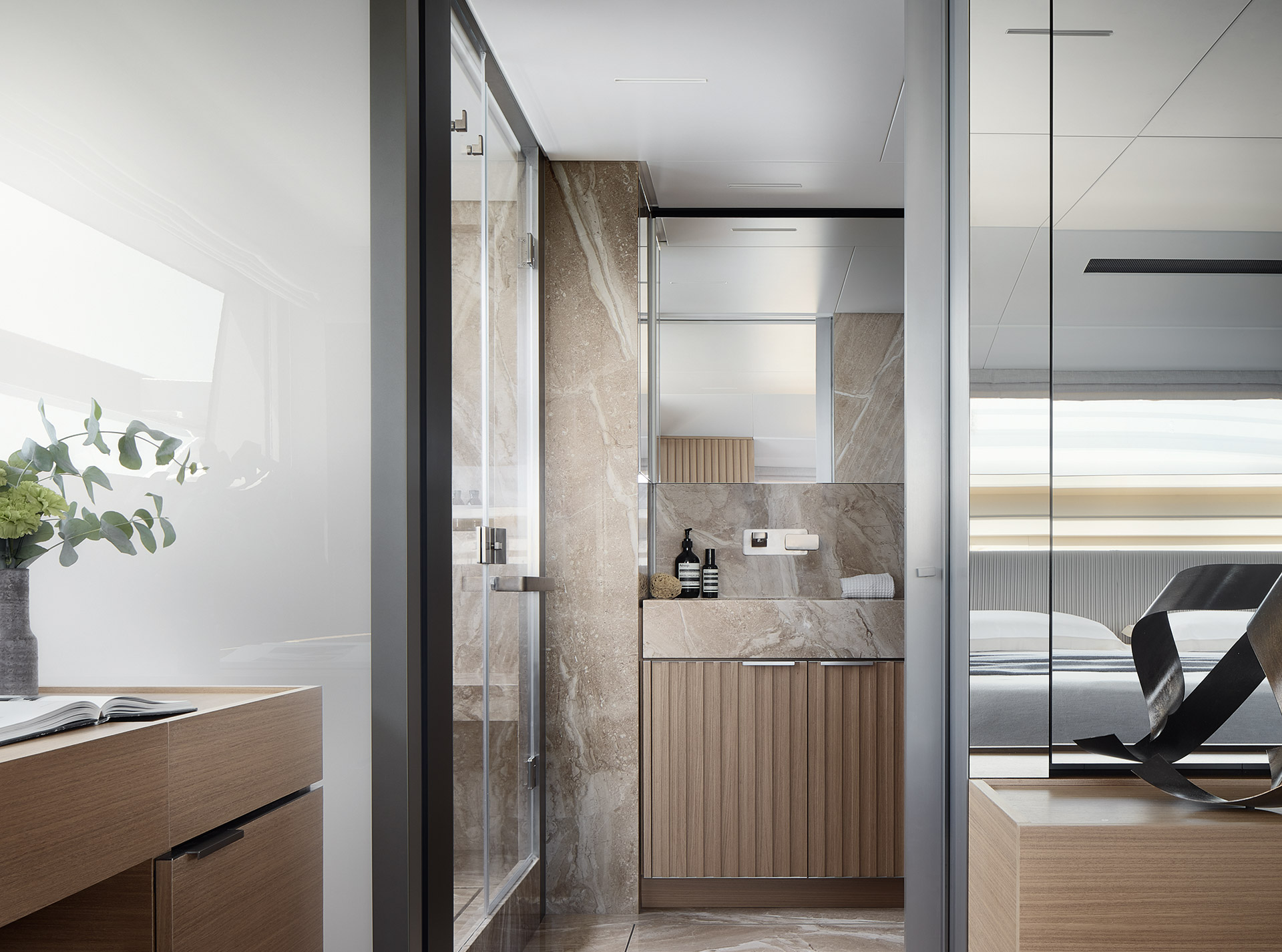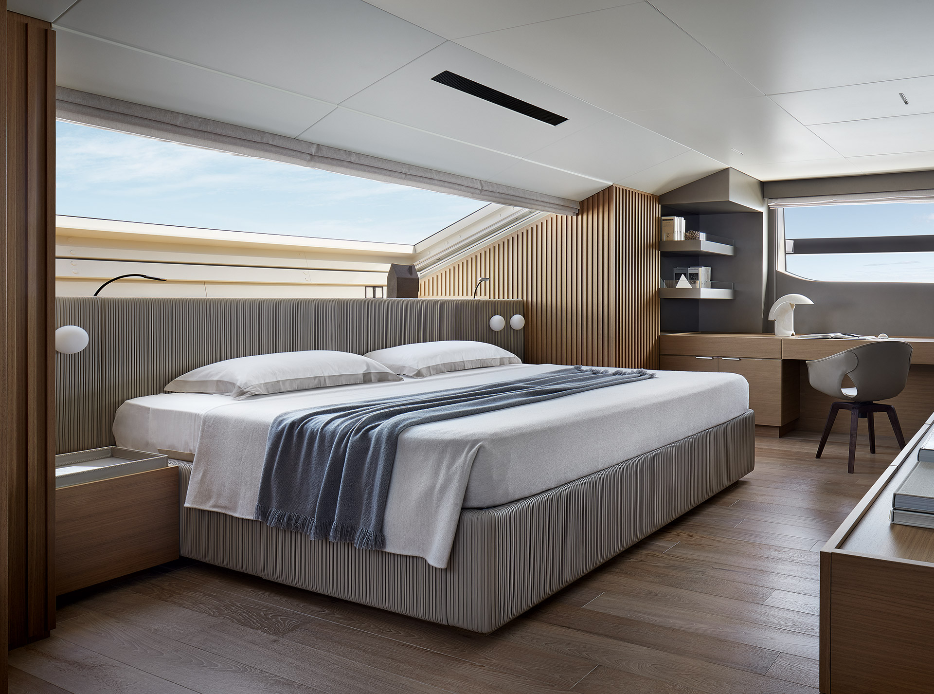 The interiors embrace lightness and harmony, with a full-beam owner’s suite and flexible living spaces. Neutral tones, walnut finishes and refined detailing create a calm, marine atmosphere of understated elegance.